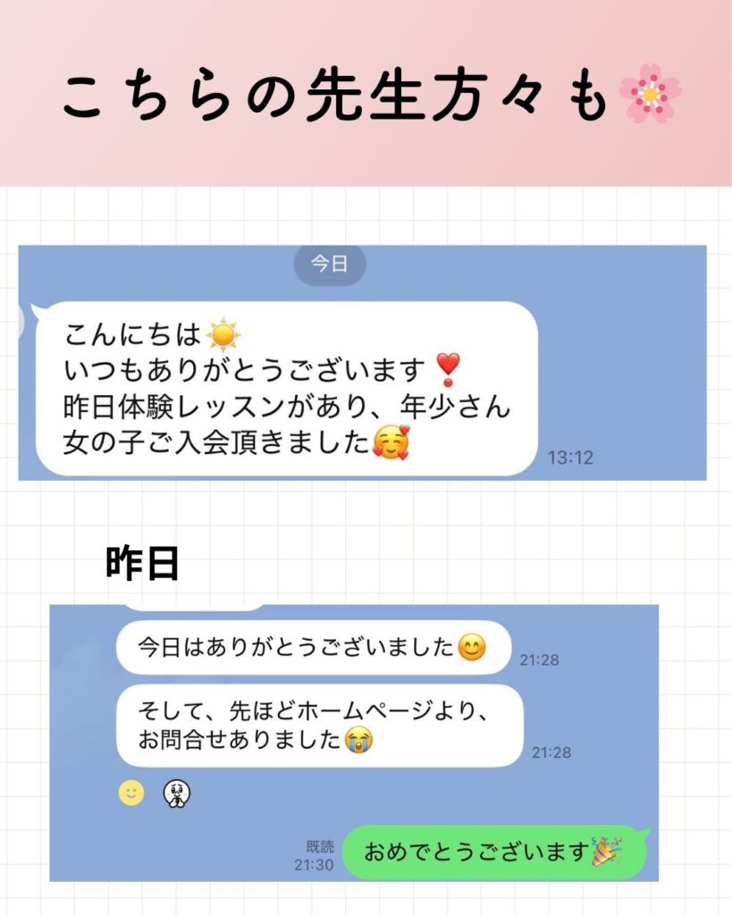 どの先生も素敵な先生方々ばかりで、絶対喜んでいただきと思いサポートさせていただいています。こうして嬉しいご報告があると、本当嬉しいです🌸